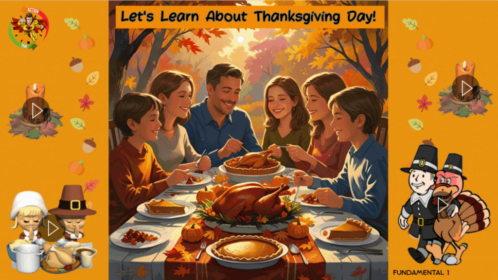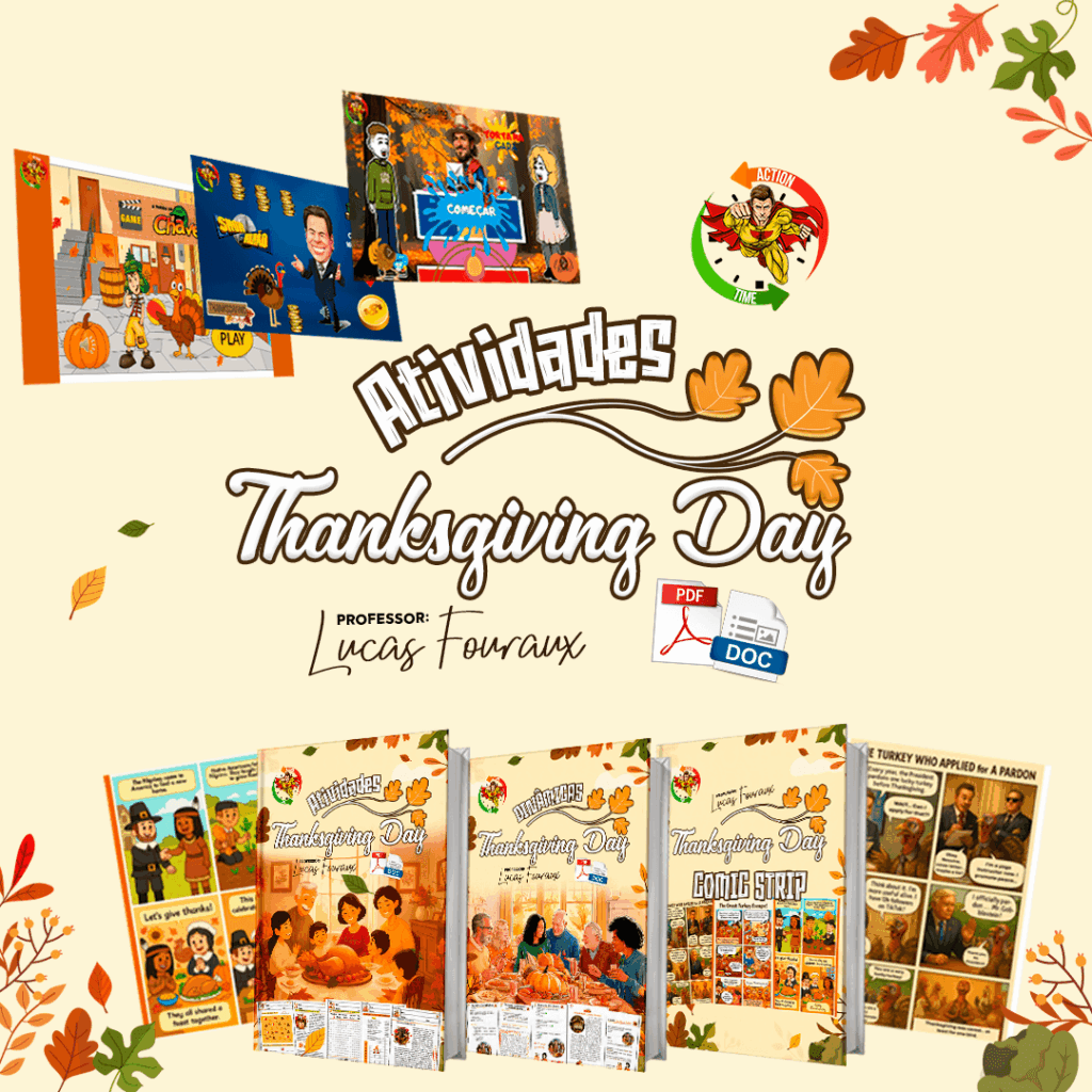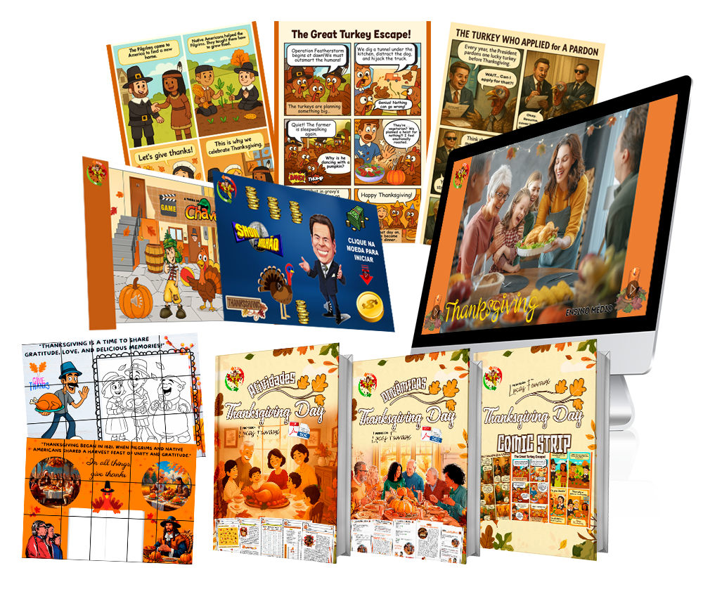 Material Inédito com Atividades, Comic Strip, Dinâmicas, Slides, Painéis e Jogos Animados em PowerPoint Sobre THANKSGIVING DAY..